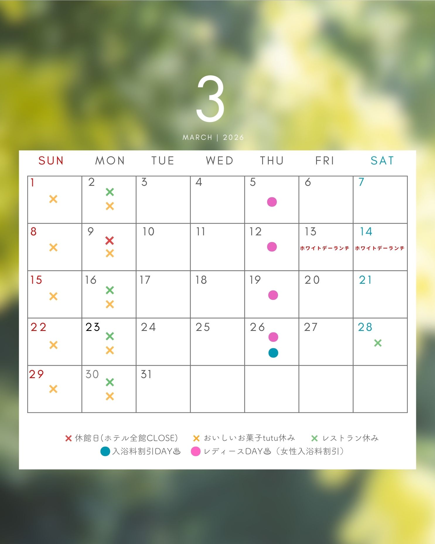 - 2、16、23、28、30日はレストランはお休みとなっております。
